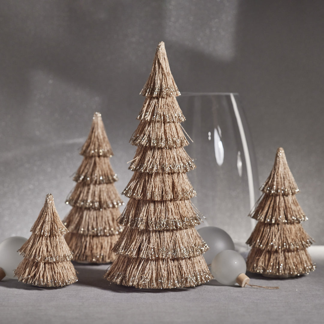 This all-natural abaca rope tree features delicate fringe accented with champagne glitter trim, bringing a refined and festive touch to your holiday decor. Its subtle shimmer and earthy texture create a harmonious balance, making it a tasteful addition to any seasonal setting. Perfectly suited for those seeking understated elegance this Christmas.