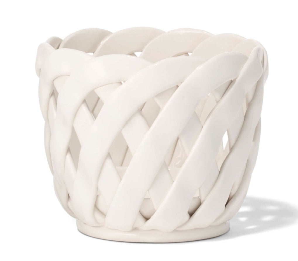 This hand built ceramic cachepot was inspired by vintage basketry, made using a weave technique that has an artisanal appeal. Crafted from white clay, it offers a beautiful interplay between light and shade to display a plant or flowers. truly versatile, adding warmth and an organic touch wherever it is placed. Styled with a plant or flowers.