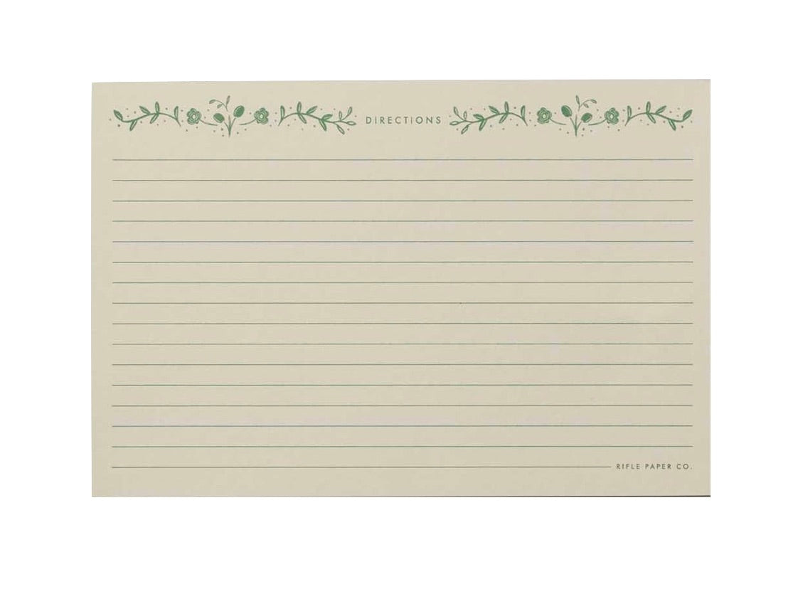 Keep track of favorite recipes with these illustrated cards, designed to slide neatly inside Rifle Paper Co recipe tins. Set of 12 cards.