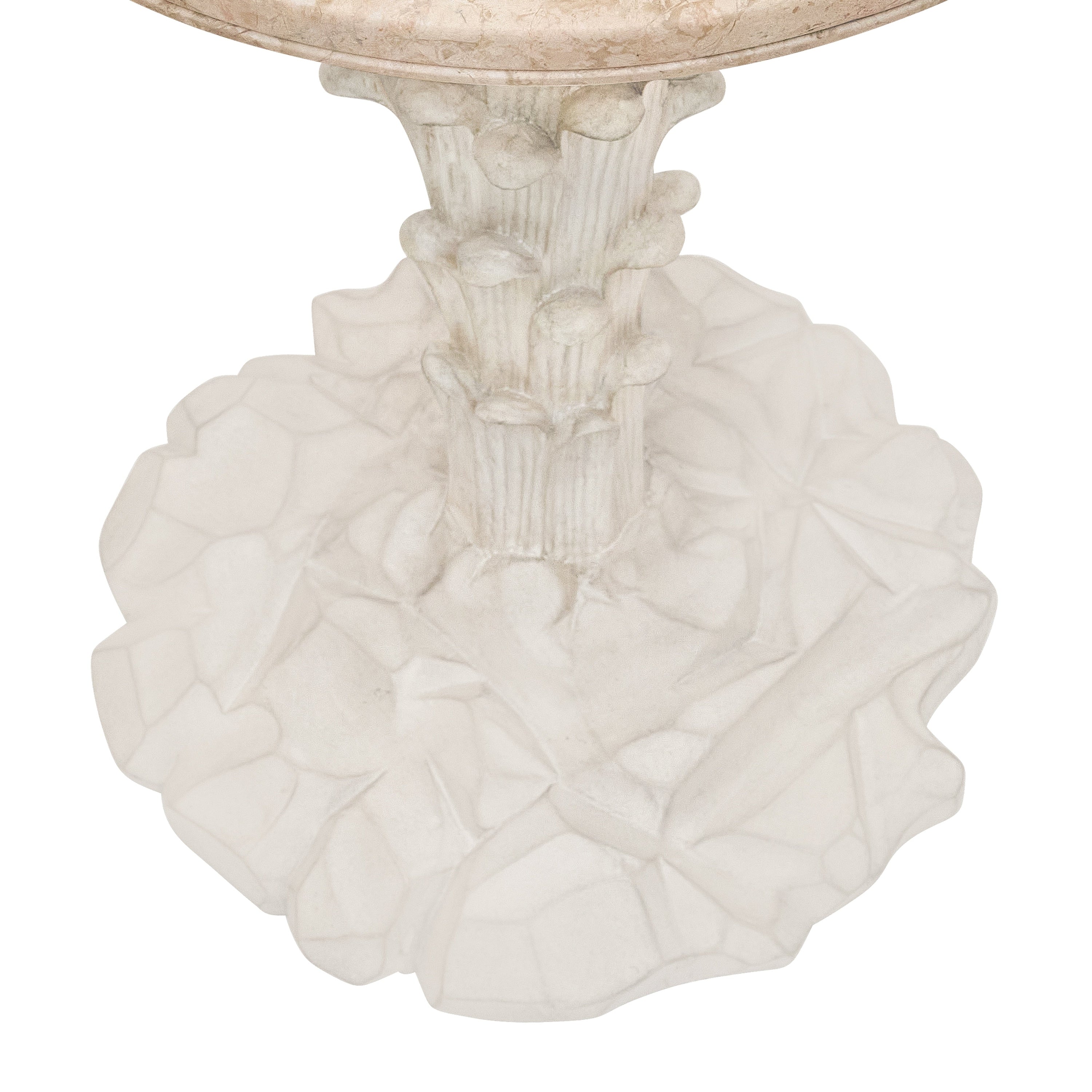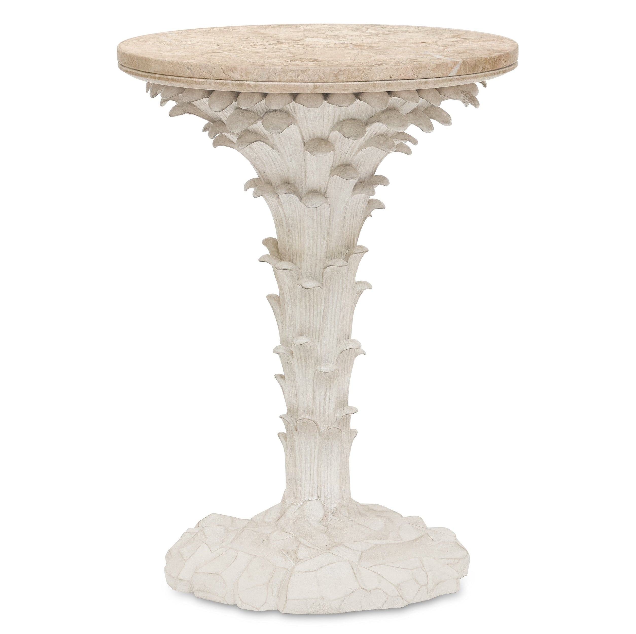 It’s perfectly sized to tuck next to your favorite armchair, stand proudly in a corner, or even steal the show as a centerpiece. It’s that rare blend of form and function, wrapped up in a design that’s timeless but never boring. Whether you’re hosting a gathering or just enjoying a quiet night in, this table’s got you covered in style. A palm frond rallies upward to support the table top, the whole anchored by a base of rocks, with a layered finish and cream stone top.