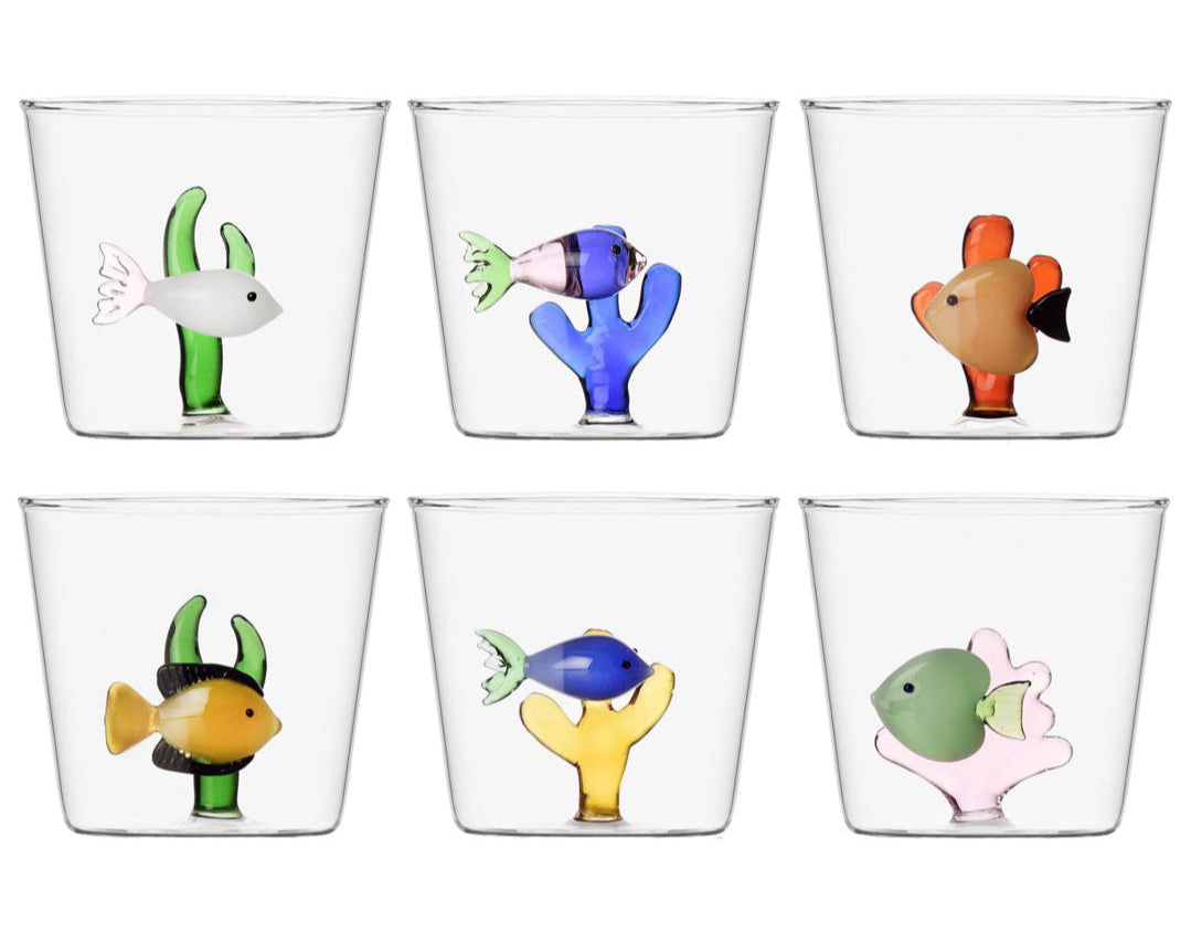 The Marine Garden glassware from Ichendorf Milano features delicate glass tumblers with vibrant, handmade glass fish embedded in the cup. Each piece showcases exceptional craftsmanship that enhances any dining experience with subtle artistry and charm.