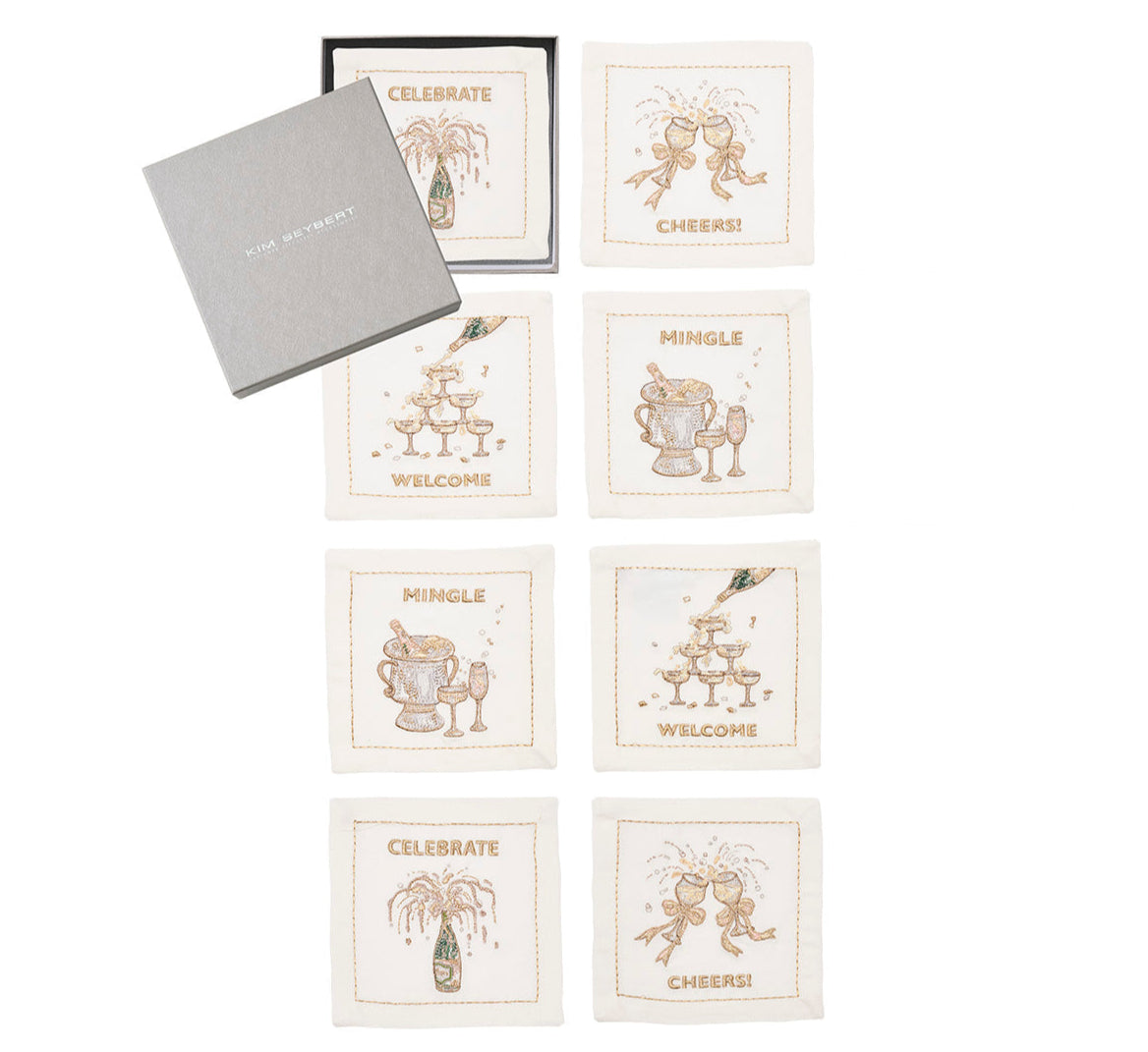 The Cheers Cocktail Napkins make every celebration sparkle with witty toast-worthy statements stitched on crisp linen. Here's to bubbly embellishments, brilliant conversation, and great taste that shines beyond the glass.